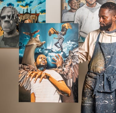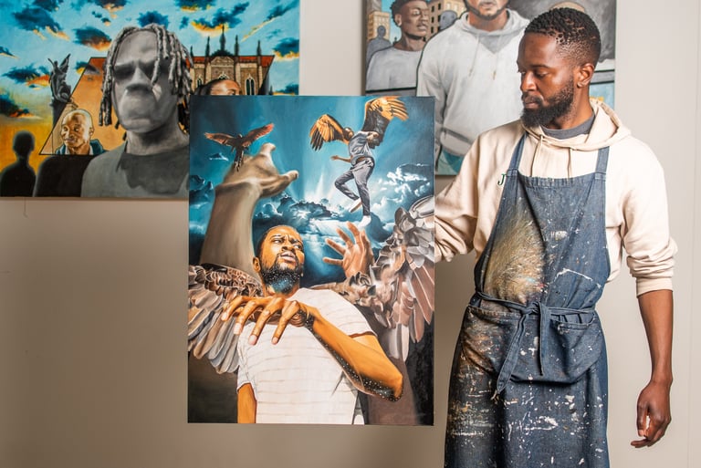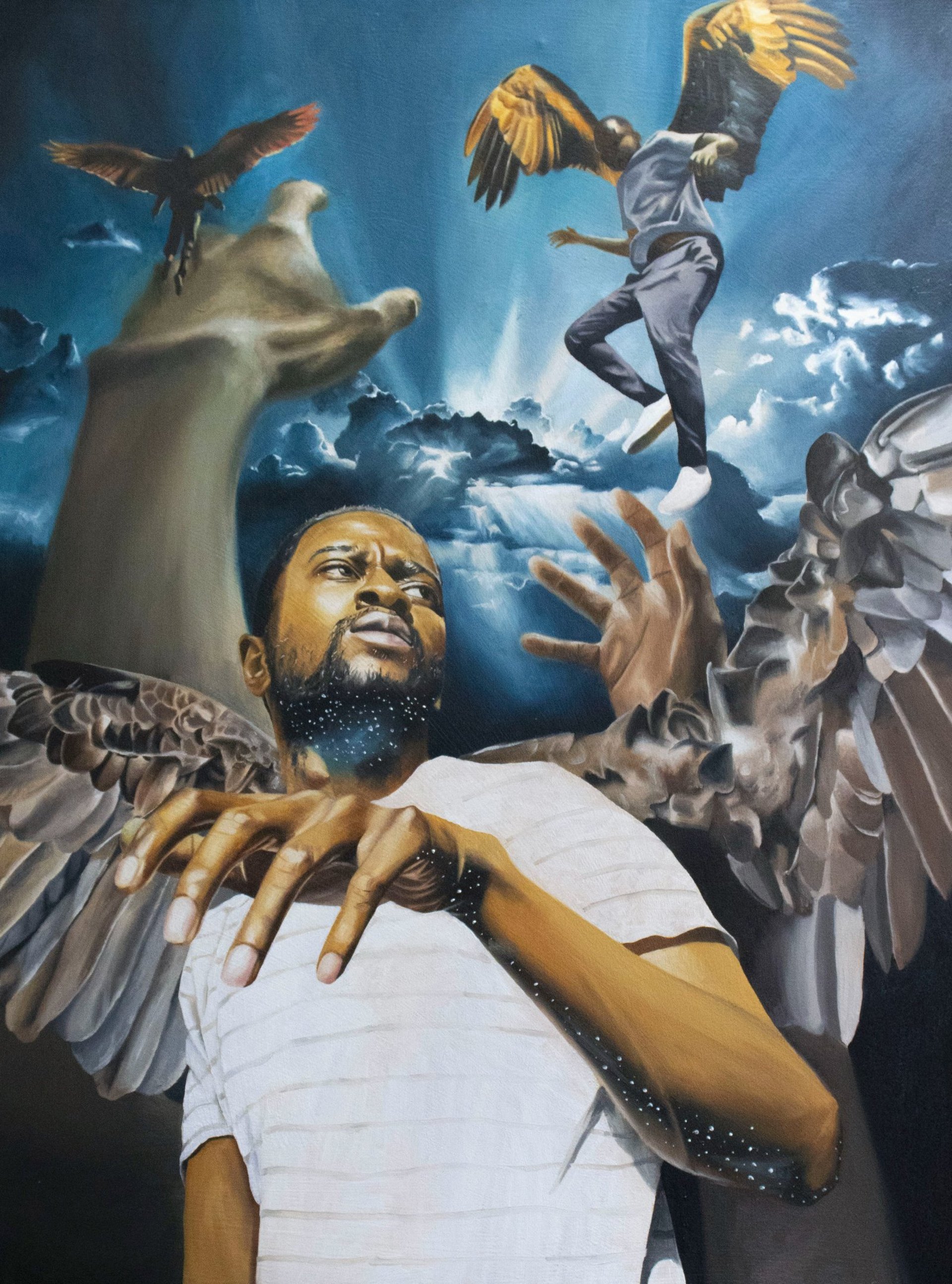 Less fixated on a particular theme, this exhibition takes a look at my holistic artistic approach in recent years. The artworks bring together six visual elements that have become familiar iconography in my paintings and that are used to express inner contemplations. These are hands, wings, light shining through clouds, portraiture, figures, and the starry night. As such, various sub-topics pop up in the exhibition but perhaps the common thread within my work is the storytelling element.